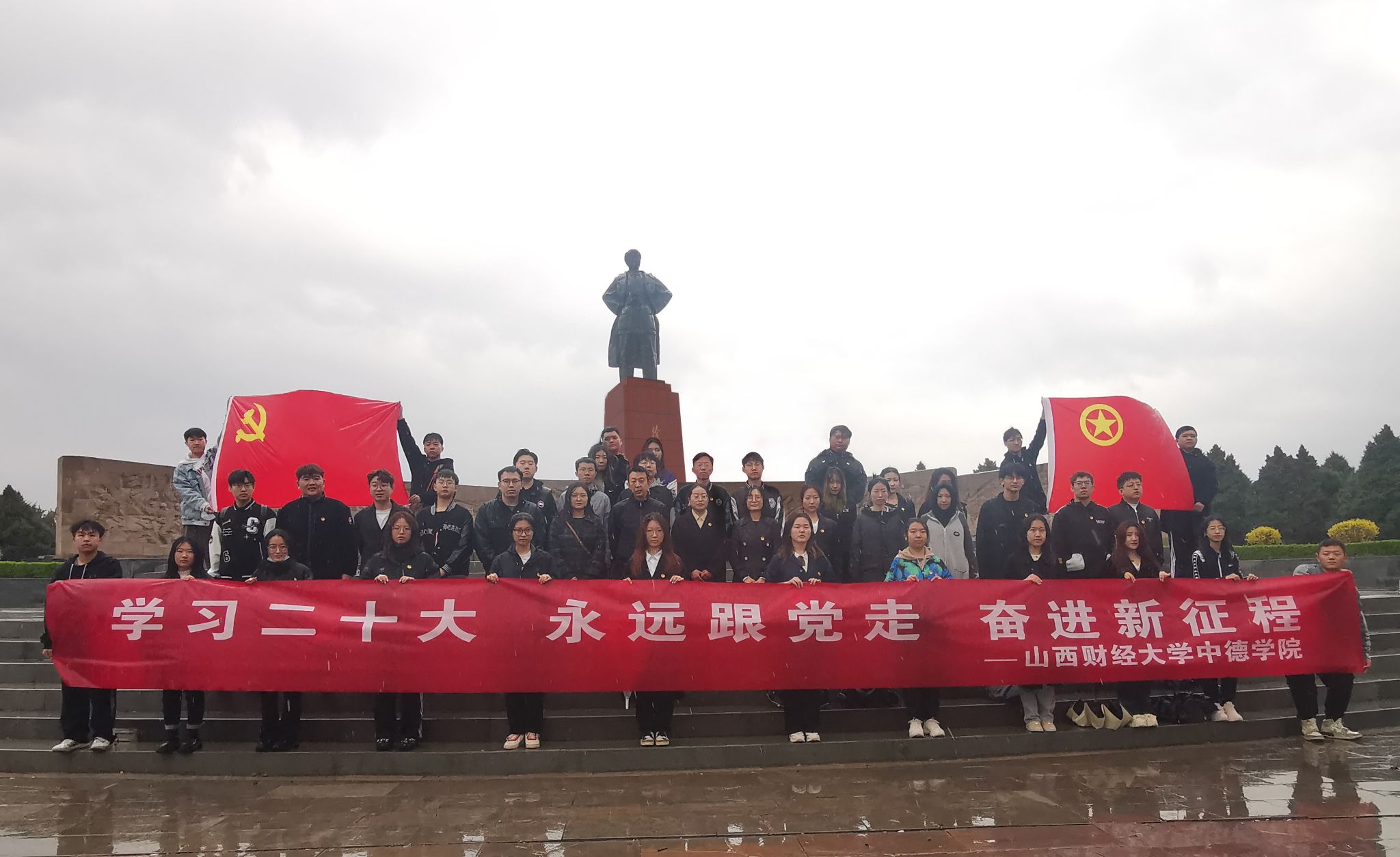 春晖寸草,细雨绵绵。初进纪念馆,“太原解放纪念碑”以雄伟之姿屹立于东山之上,抚慰无数逝去的英灵,向来者讲述革命的辉煌。在讲解员的引导下,一幕幕壮烈景象映入眼帘,模糊的照片清楚地讲述着革命年代的艰难岁月,斑驳的遗迹清晰地展现出战争的剧烈。师生们庄严地站在烈士雕像前,神情庄重,心怀感激,共同缅怀伟大的先烈。
