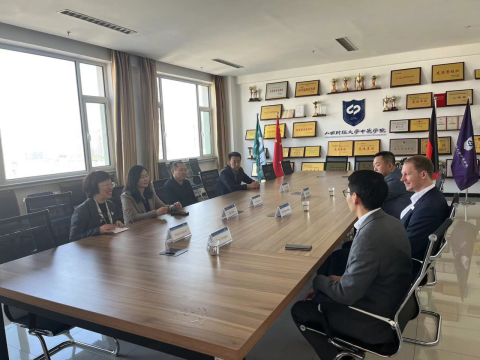 随后,学院领导会见了海蒂诗(Hettich)(上海)公司总经理Daniel Giesselmann一行3人,刘臣洲书记代表学院对Daniel Giesselmann总经理一行表示热烈的欢迎,对为米乐官网即将毕业学生所做的职业生涯规划讲座表示衷心的感谢。史贞院长介绍了学院的发展历程及基本情况,希望未来双方能够加强全方位合作,为学生实习就业搭建平台,为校企双方合作共赢打好基础。Daniel Giesselmann总经理非常感谢学院的诚挚邀请,他表示学院培养既懂语言,又懂专业,有国际化背景的毕业生,是他们企业以及其它跨国企业所青睐的人才。并表示未来希望可以进一步加强合作,加强沟通,助力米乐官网国际化人才培养。