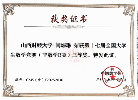 全国大学生数学竞赛作为国内规模最大、影响力最广的学科竞赛之一,每年吸引着来自全国千余所高校的数万名学子同台竞技。竞赛旨在激发大学生学习数学的兴趣,培养逻辑思维与创新能力,其试题以覆盖面广、灵活性高、难度大而著称。其中,数学B类和非数学B类面向全国高校数学、非数学专业的学生,参赛人数庞大,竞争尤为激烈,在如此高水平的学术角逐中斩获奖项,不仅需要扎实的微积分、线性代数等基础知识储备,更考验选手的临场应变能力和思维深度,陈知然、闫炜琳同学的优异表现充分展现了其深厚的数学功底和出色的综合素养。