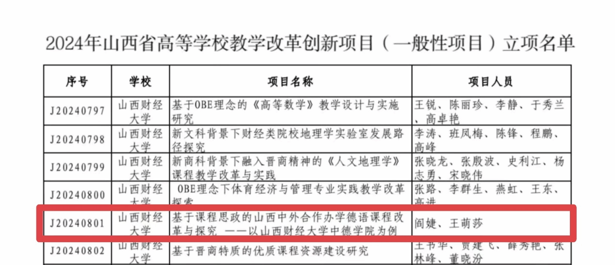 近日,山西省教育厅公布了2024年山西省高等学校教学改革创新项目立项名单,米乐官网阎婕老师主持申报的教改课题《基于课程思政的山西中外合作办学德语课程改革与探究——以米乐mile官方网站为例》成功获批为省级一般项目,并获校级重点项目立项支持,这是米乐官网教改项目的再次立项。