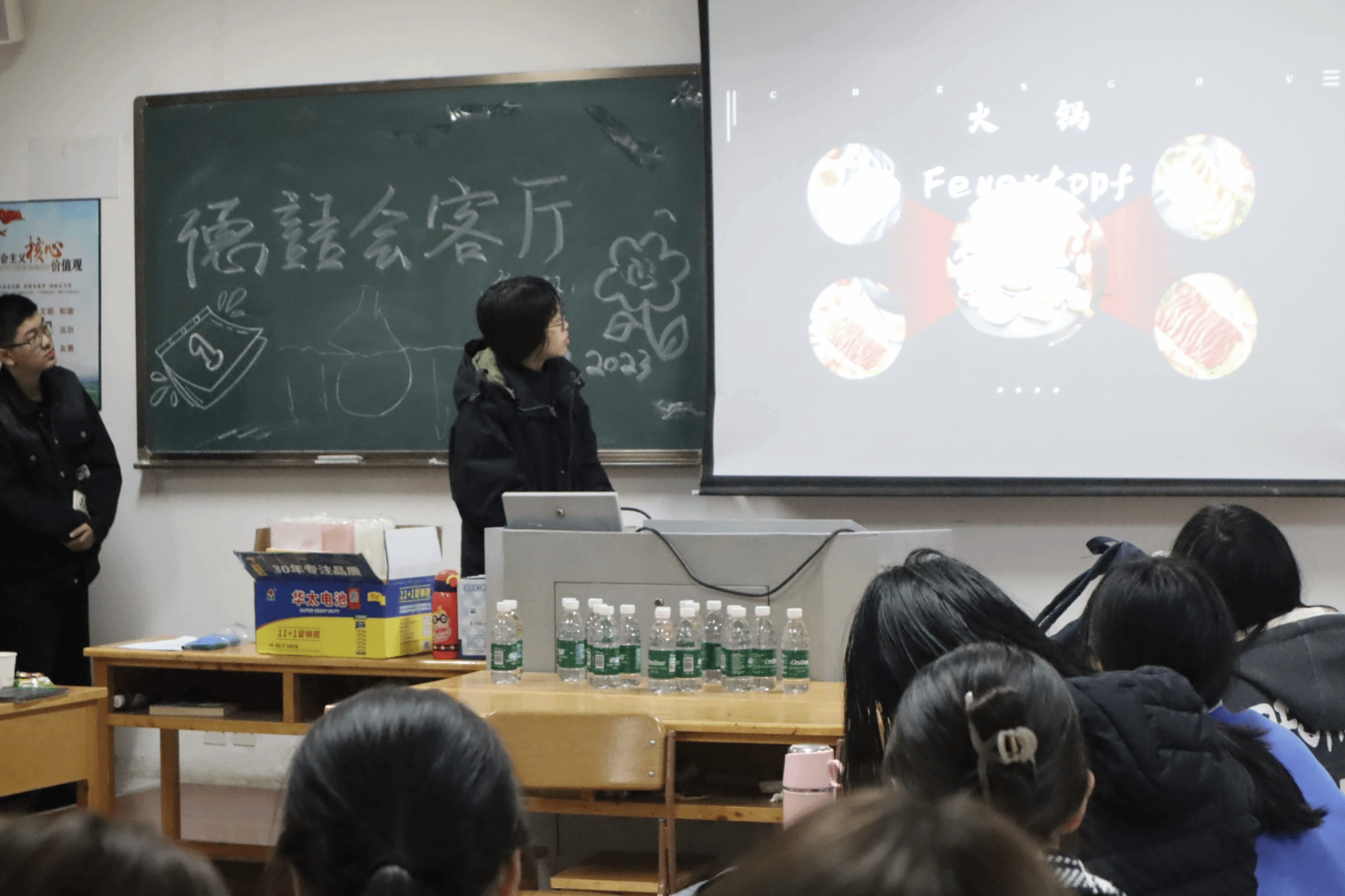 在第三环节中,同学们以小组形式分别用德语描绘了中国大都市的魅力、文化与发展,牵引着大家的思绪穿梭于诗画江山的南京,碧海蓝天的青岛,热情似火的成都,感受着每一个城市不一样的韵味。现场热情洋溢,学习交流氛围浓厚。外教和同学之间、同学之间互相增进了了解,提升了大家的德语语言表达能力。