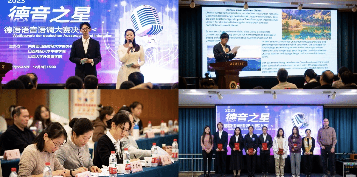 在特邀评委组组长、太原科技大学张宇副教授宣读比赛规则后,此次比赛正式开始。比赛共有三个环节:自我介绍、自备文稿朗读和现场抽题朗读。朗读文稿主题包括:我的家乡、寻美中国、中国式现代化、中华优秀传统文化和我眼中的德国等。在比赛现场,来自两个学校的选手所选主题丰富,文体多样,从中国传统节日到中国速度追忆,从应用文到诗歌,无一不是德语语音标准,声情并茂,展现出了极高的德语知识素养和家国情怀;由来自三所高校的七位德语教师共同组成的评委组慎重评分。此外,比赛中穿插了游戏环节,包括德语绕口令、德语知识问答和视频问答等,不仅增加了比赛的趣味性,也激发了学生们学习德语的内驱力。