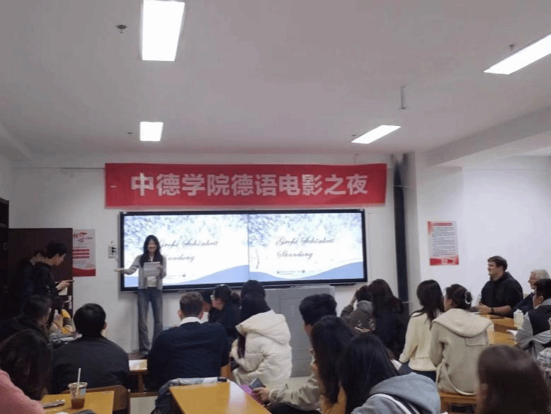 在本周二晚的电影之夜活动中,来自山东省的三位同学李新怡、傅诗宸、肖博文运用 PPT 展示与观看视频相结合的方式,以德语为媒介,生动展示了他们的家乡风貌。活动结束后,同学们热情高涨,积极与外教展开交流,悉心聆听纯正的德语发音,沉浸于浓厚的德语学习氛围之中。