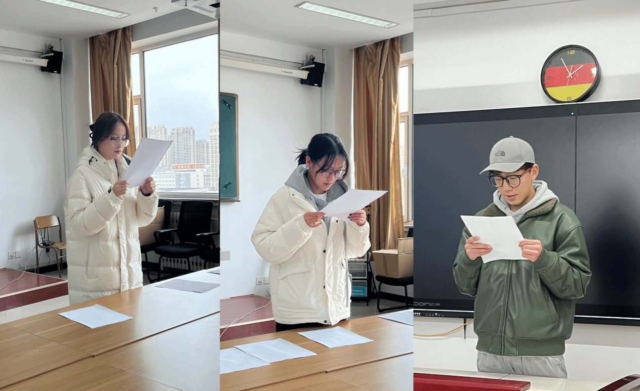 在比赛过程中,学生们依次上台抽取题目进行朗读。题目涵盖了德语字母、字母组合、音节、单词和句子。这既考验了学生们的发音准确性,也检验了他们的连贯性和语感。选手们朗读时发音标准,语调自然,语速适中,充分展示了他们扎实的德语基础和良好的口语表达能力。