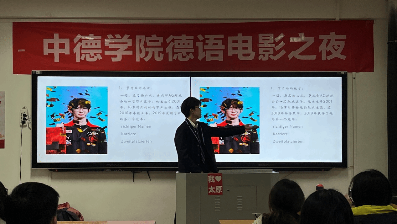 电影之夜开场,大一德语四班的刘子牧同学带来了优秀作业展示。此前在课堂报告中,刘子牧同学凭借精心筹备的脱稿演示,获得了多位德语教师的高度认可,被评为优秀作业。此次电影之夜,大一各班同学齐聚一堂,刘子牧同学自信从容、侃侃而谈,充分展现了扎实的专业素养与个人风采。