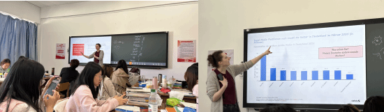 在外教Frau Sobilo的口语课上,学生们首先练习了预约时间的对话。在对话结束后,Frau Sobilo引导其他学生表达该对话中的重要信息。另外,外教引导学生们介绍自己使用最频繁的媒体,分享使用目的和使用感受,同时展示了关于“德国人最受欢迎的媒体”的最新图表数据,引导学生结合图表中的数据和信息进行口语表达。学生课堂参与度较好,但口语表达的主动性有待提高。