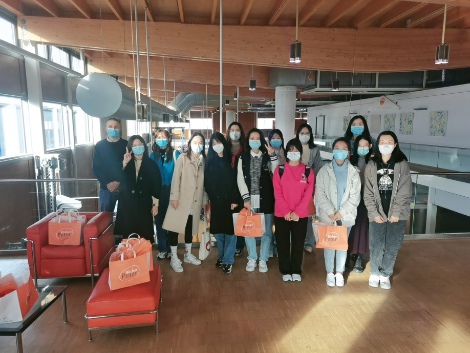 烘焙过程中,面包师给同学们品尝了新鲜出炉的面包和巧克力。烘焙好后,将同学们自己制作的面包细心包装,并将面包坊的现烤面包送给同学们。结束参观之后,面包坊还赠送了每们同学特别的小礼物并合影留念。大家都异常兴奋,既了解了德国面包文化,也掌握了一项新技能。