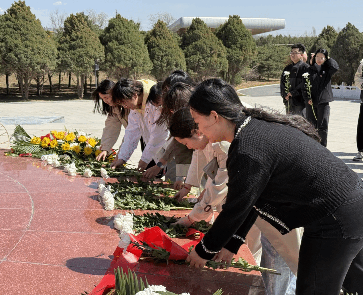随后,全体师生高声齐唱中华人民共和国国歌。在嘹亮歌声里,共同缅怀英雄的卓越功勋,深刻领略爱国志士们视死如归、勇往直前的崇高爱国情怀。大家手捧白色花束,依次献花致敬,在革命英雄雕像前伫立,默默表达心中的无限敬仰与深切缅怀。
