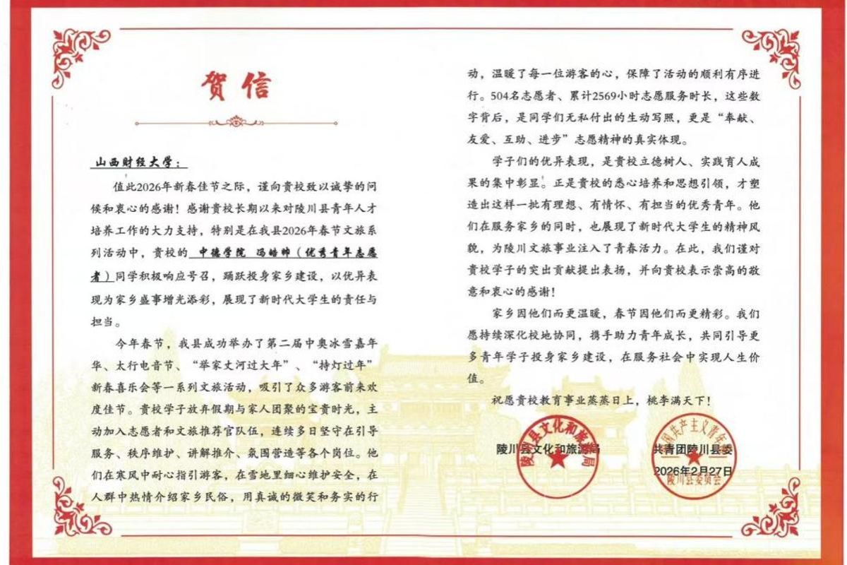 近日,MILE米乐集团收到来自山西省陵川县的一封贺信,信中高度赞扬了米乐官网2025级中德会计学2班学生冯皓帅,在寒假期间积极投身家乡志愿服务、助力新春文旅系列活动中的优异表现。