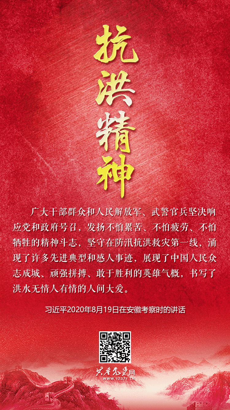 大江奔涌,抗洪精神接续传承。2020年,我们又一次取得抗洪抢险斗争胜利,习近平总书记在安徽考察时深入防汛救灾一线,指出“广大干部群众和人民解放军、武警官兵坚决响应党和政府号召,发扬不怕累苦、不怕疲劳、不怕牺牲的精神斗志,坚守在防汛抗洪救灾第一线,涌现了许多先进典型和感人事迹,展现了中国人民众志成城、顽强拼搏、敢于胜利的英雄气概,书写了洪水无情人有情的人间大爱”。2021年7月,河南等地持续遭遇强降雨,郑州等城市发生严重内涝,习近平总书记对防汛救灾工作作出重要指示,强调“要始终把保障人民群众生命财产安全放在第一位”“最大限度减少人员伤亡和财产损失”。历史和现实充分证明,无论什么样的风雨和风险挑战,都无法阻挡中华民族的前进步伐,都无法阻挡中国人民对美好生活、对伟大梦想的不懈追求。‌